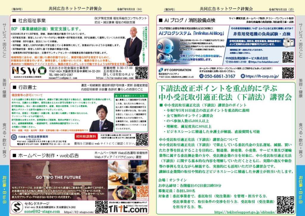 茨木市内、高槻市内に拠点を置く事業者、または、茨木市・高槻市を商圏とされる事業者が、会員相互に会員事業者を紹介しあう共同広告のグループです。